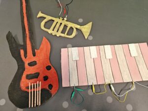 Leerlingen kunnen een instrument ontwerpen van karton en dit aansluiten op een Makey Makey.