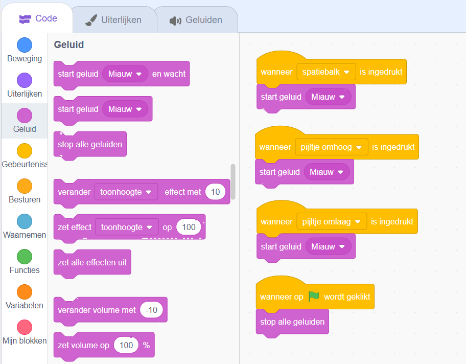 - Open Scratch op het bord en laat zien hoe de leerlingen de verschillende toetsen aan een geluid kunnen koppelen. Je gebruikt hierbij de blokken uit het plaatje hieronder. Als je op het pijltje naast ‘miauw’ klikt, kun je zelf audio opnemen. Op deze manier kunnen de leerlingen hun eigen geluiden toevoegen.